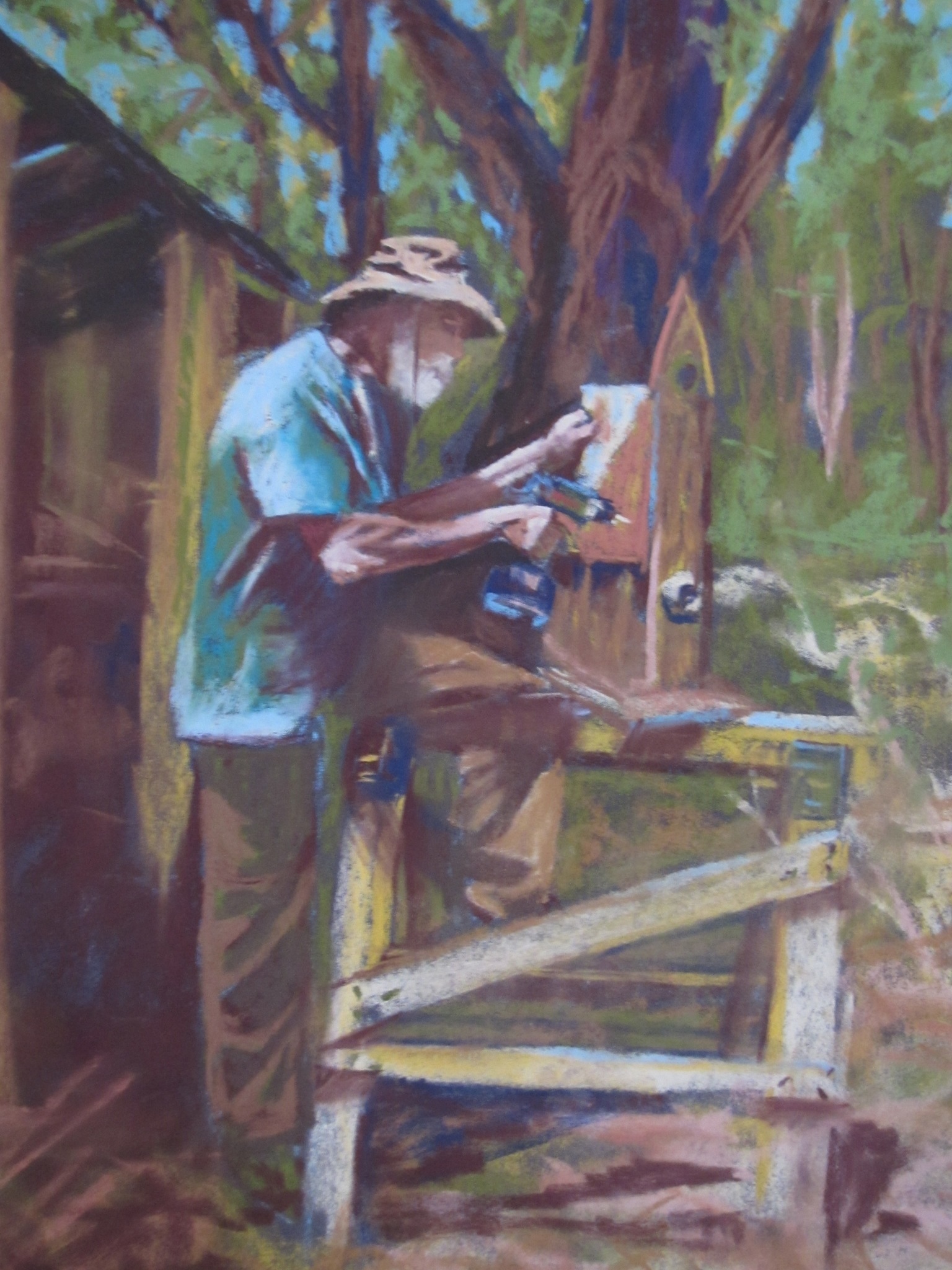 This an artist friend of mine named Tom. I got to spend a week in the work shop with him taking a class called fantasy bird house building. It reminded me of being with Santa during July, and it wasn’t just the white beard and jovial disposition. First he had us sketch out our houses, and then with a chuckle and a twinkle in his eye he would brainstorm on how to make our dreams come true. My bird house was a beautiful church with not one, but two stained glass windows, lots of elaborate iron work, a copper roof, and he let me build much of it with a baby on my hip. What a great week, my 7 year old learned to use a drill press, and my dream house became a reality.