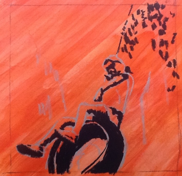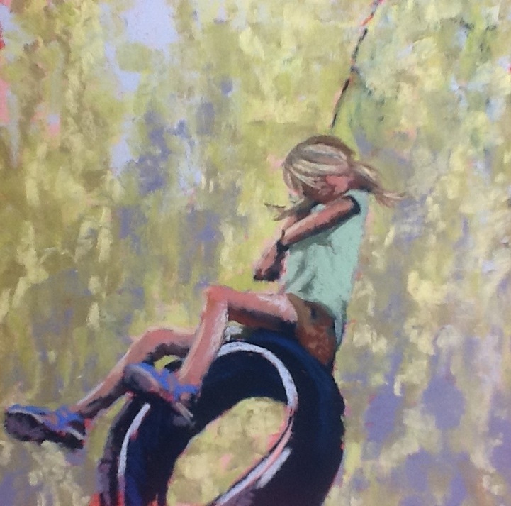 In case you are curious, here is how I started this painting. First I identified why I wanted to paint the painting: I loved the movement of the swing and dappled light of the trees in the background. Then I planned my approach: I started on sanded Wallis paper that I under painted with pink and red pastel, and then washed with denatured alcohol. I chose those colors because red is the compliment of green, and this panting is mostly green. Then I drew a skeleton of lines in light blue so I wouldn’t get lost, next I put in my darkest darks in a dark blue green (it looks almost black in the photo, like a true impressionist, I never use black). I unified shadows and darks and added and deleted until I had roughly an S shaped composition of darks. I liked the tension of the tire swing being cropped out. After I had the groundwork established, the rest was just play! What I am most pleased with in the finished painting: her feet.