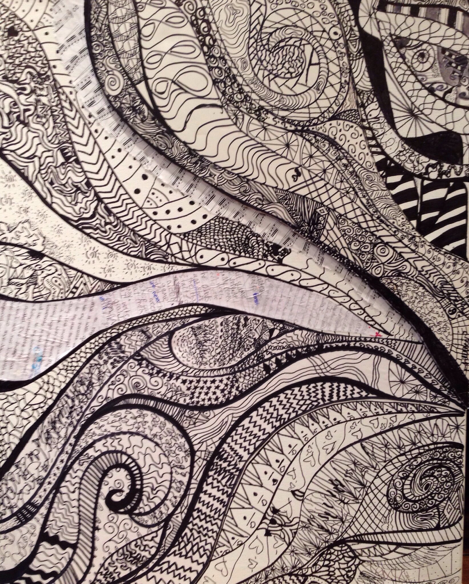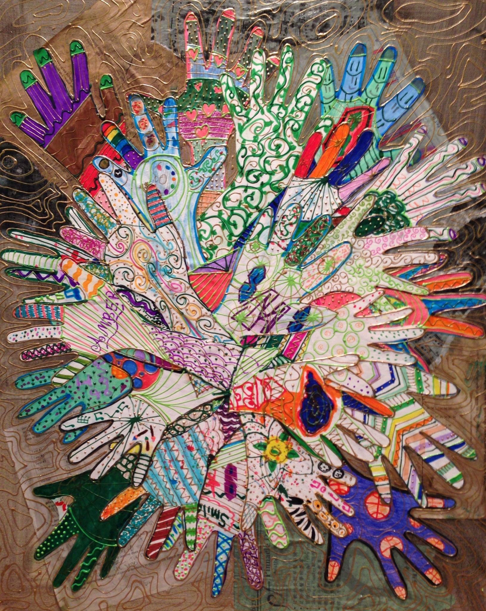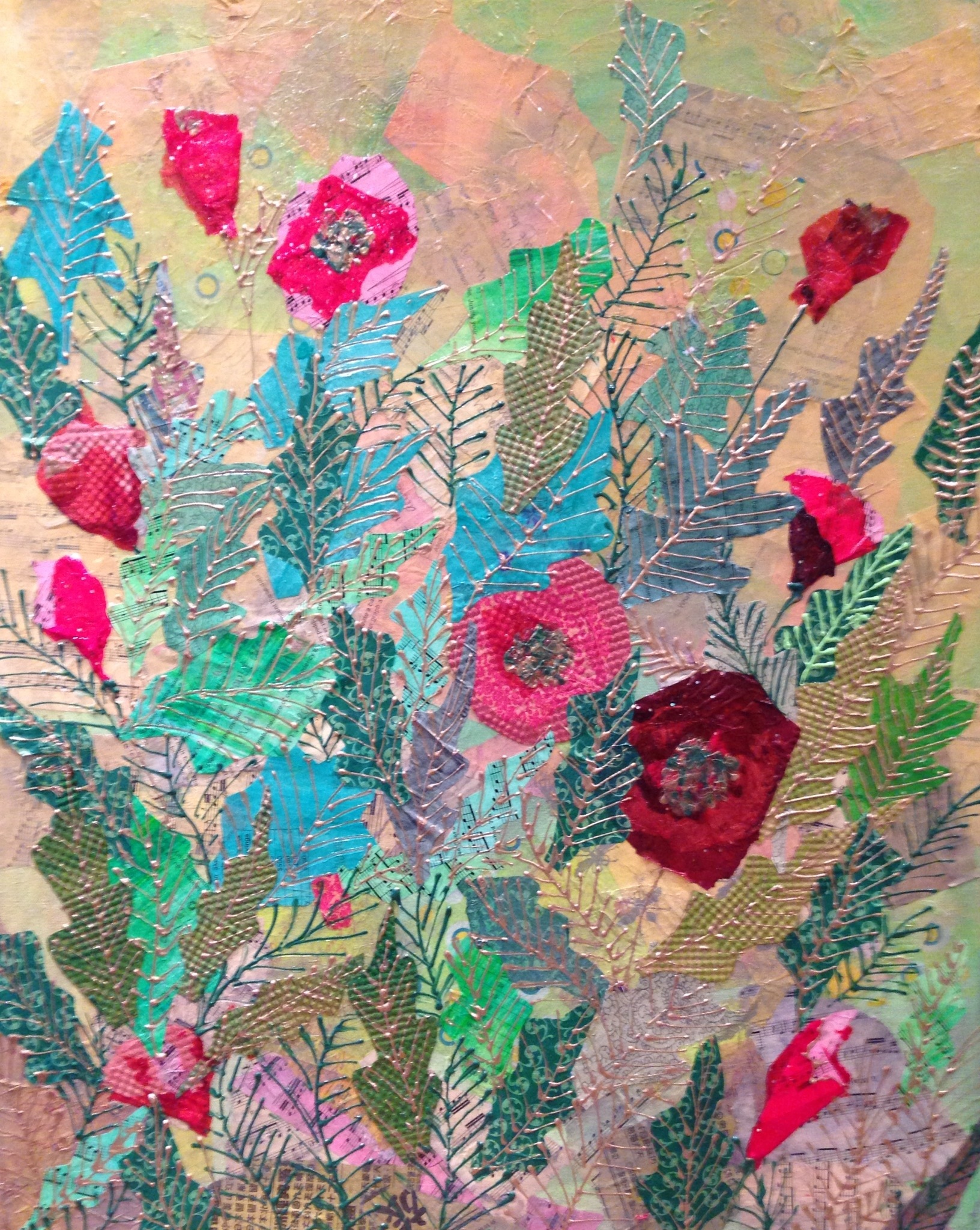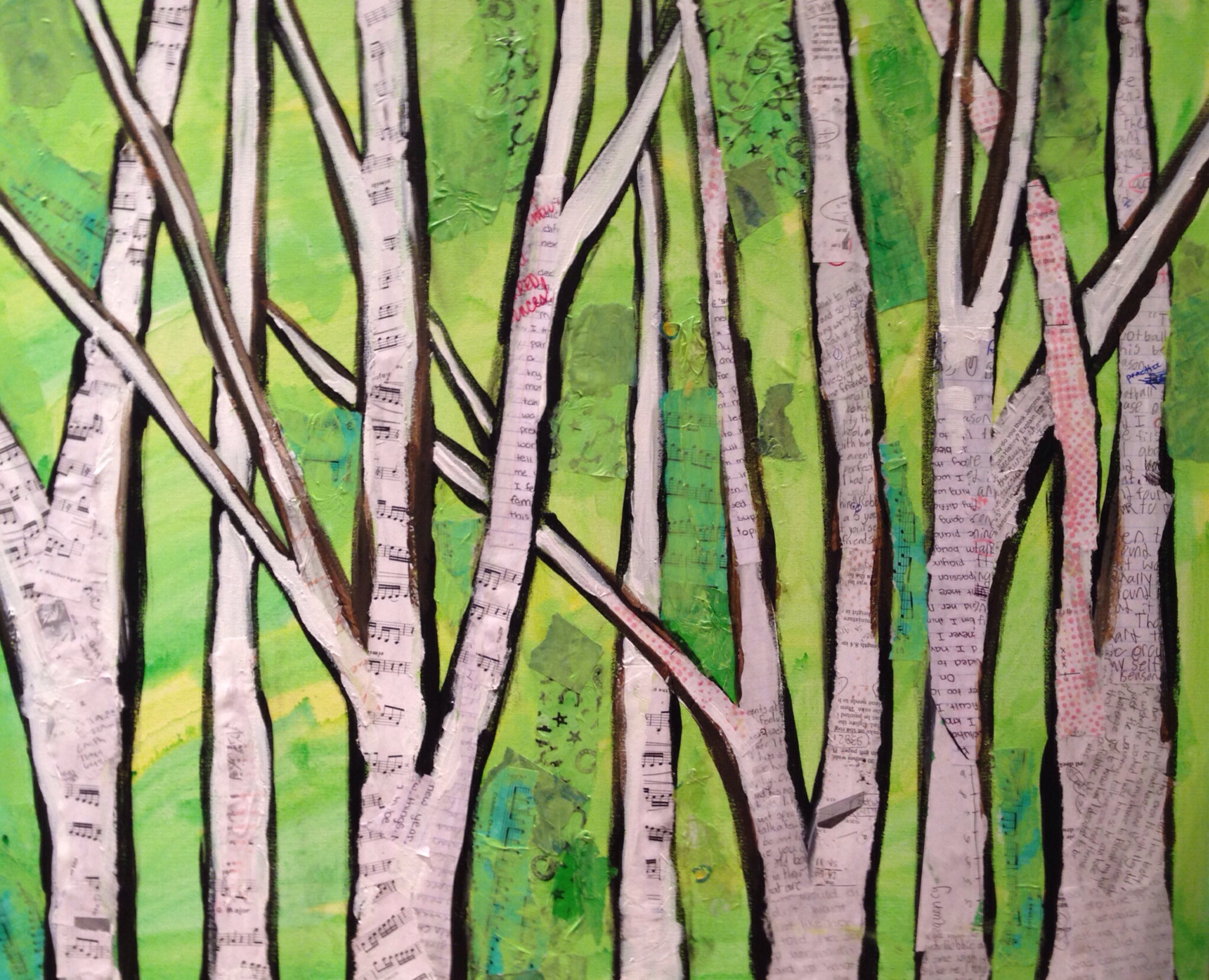 Being a local artist in the community and having four children, I was of course asked to help come up with ideas for the auction at the Gala which raises funds for our school. It was fun to think of ideas that many children could work on bit by bit and produce something that someone would want to bid on. It was delightful and chaotic to work with the kids. All 4 canvases are 24″x30″. They were created with mixed media, and among the collage you can find: homework, math problems, rough draft essays, sheet music from band and choir.