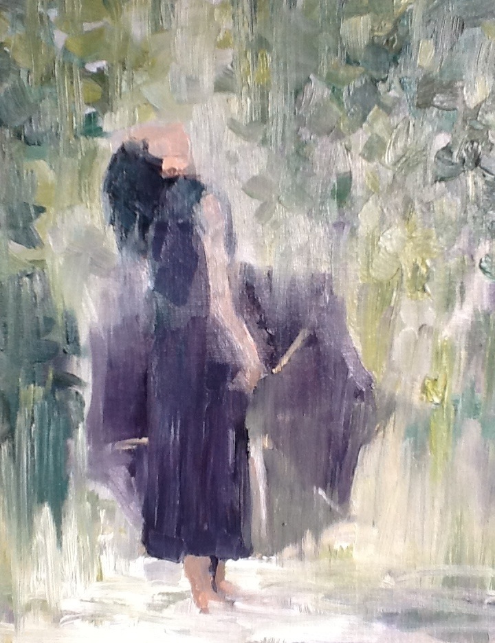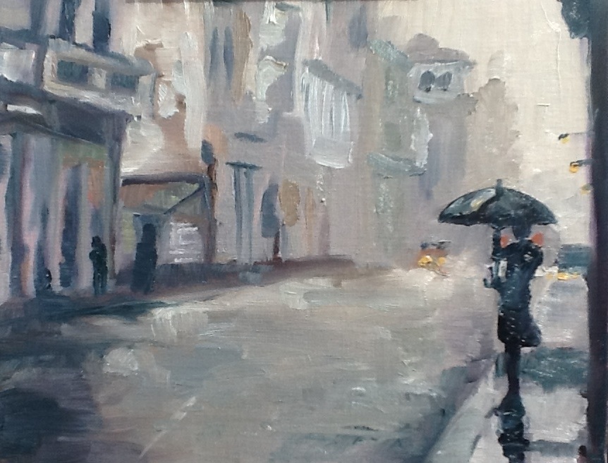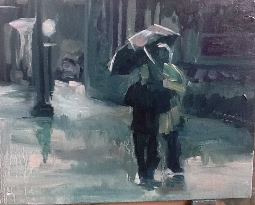 I am not experiencing a storm: metaphorical, or geological. I have been traveling and had time and willingness to paint. I realized that I had about the same amount of white paint, that if it were toothpaste, I could brush my teeth 3x. If you paint in oils you know white is the one color you must have. Failing to plan is planning to fail. So I planned a painting based on color: my puddle of mud left from an earlier painting, darks, and my 3 dabs of white. Circumstances brought about the storm; that happens sometimes.