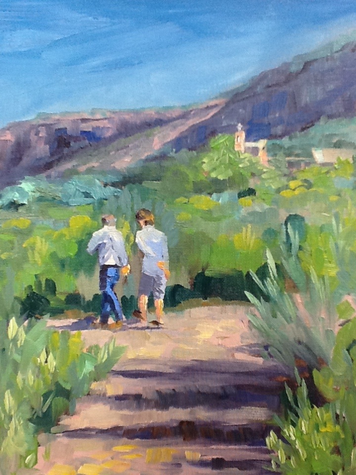 1. Hi, We have met a few times at Incarnation.  I love your painting “Show Me the Way Abuelo” and want to inquire about a possible commission.  I am envisioning this same painting but with my son and our dog in the place where the 2 boys are.  Size-wise, I am thinking roughly 30 X 40, oil on canvas.  Can you tell me how much this would cost and what the turn-around time would be?  I know you are in NM for the summer.  Thank you.  I look forward to hearing back from you. Jann Mackey
