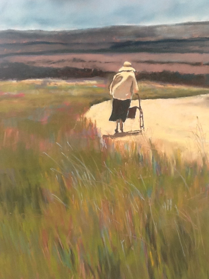 I jumped out of my seat the other day when I saw this beautiful, sprite of a woman charging across the alfalfa field. I loved the abstract shape that the sunlight was making connecting her hat and blouse and I knew it would make a beautiful painting. So…I ran and chased her down the road trying to snap a photo. Don’t let the walker fool you, she was trucking. I was inspired and touched. I loved that she returned to the ranch with a walker instead of staying home. I enjoyed watching several elders interact with their families last week. Three different families were here with someone who was in need of special care and it was a joy to watch them nurture and help. I hope that when someone in my family has a stroke, or goes blind in one eye, or whatever ailments age or life bring I will be there to help them continue to do what gives them life. I also hope that when my balance falters I will buy a walker, ask for the help I need, and keep on trucking!