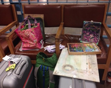 Today I have happily found another wrinkle – here is my airport studio. Before you tell yourself how organized I am, notice the yellow, mark-of-shame, late check-in tag on my luggage.