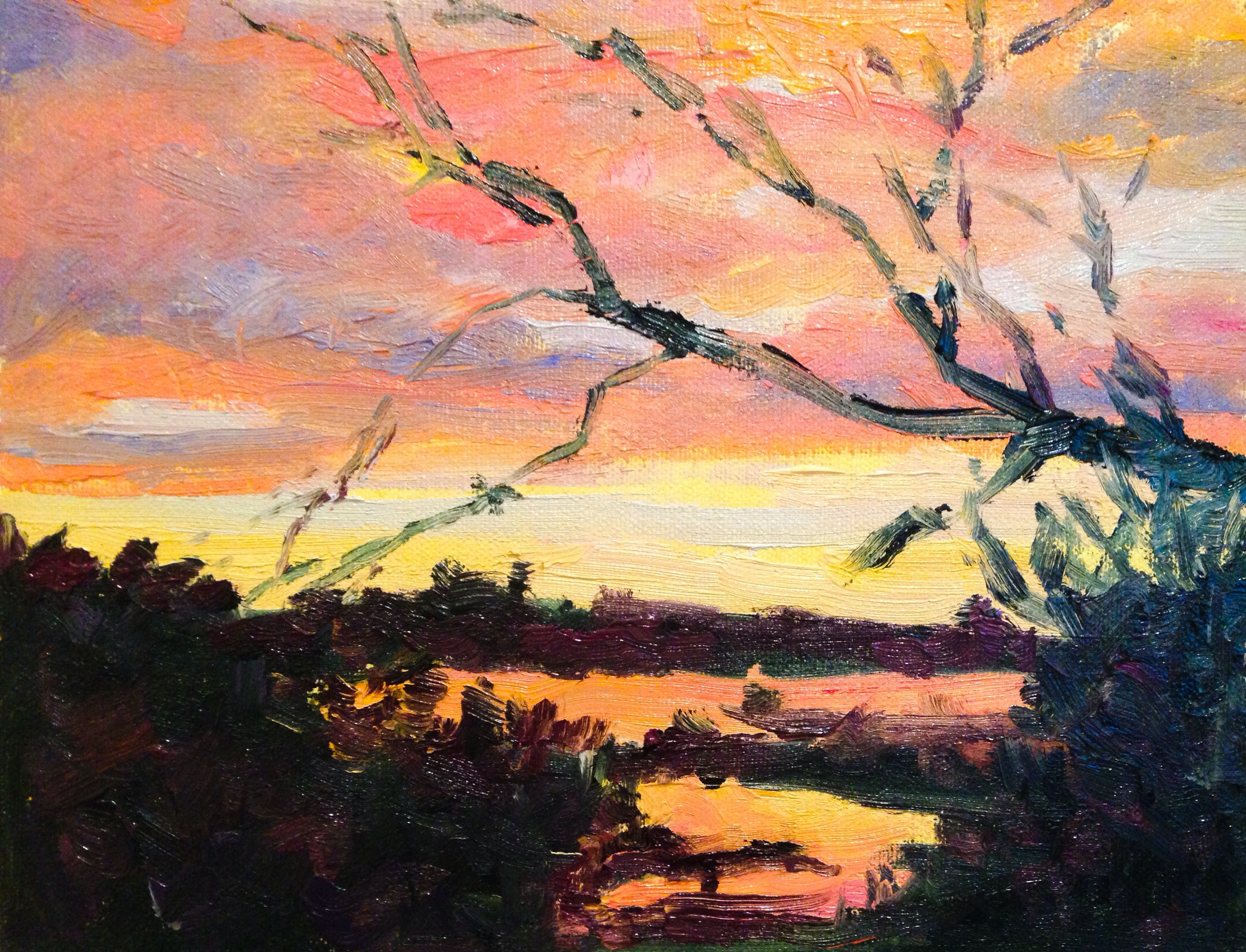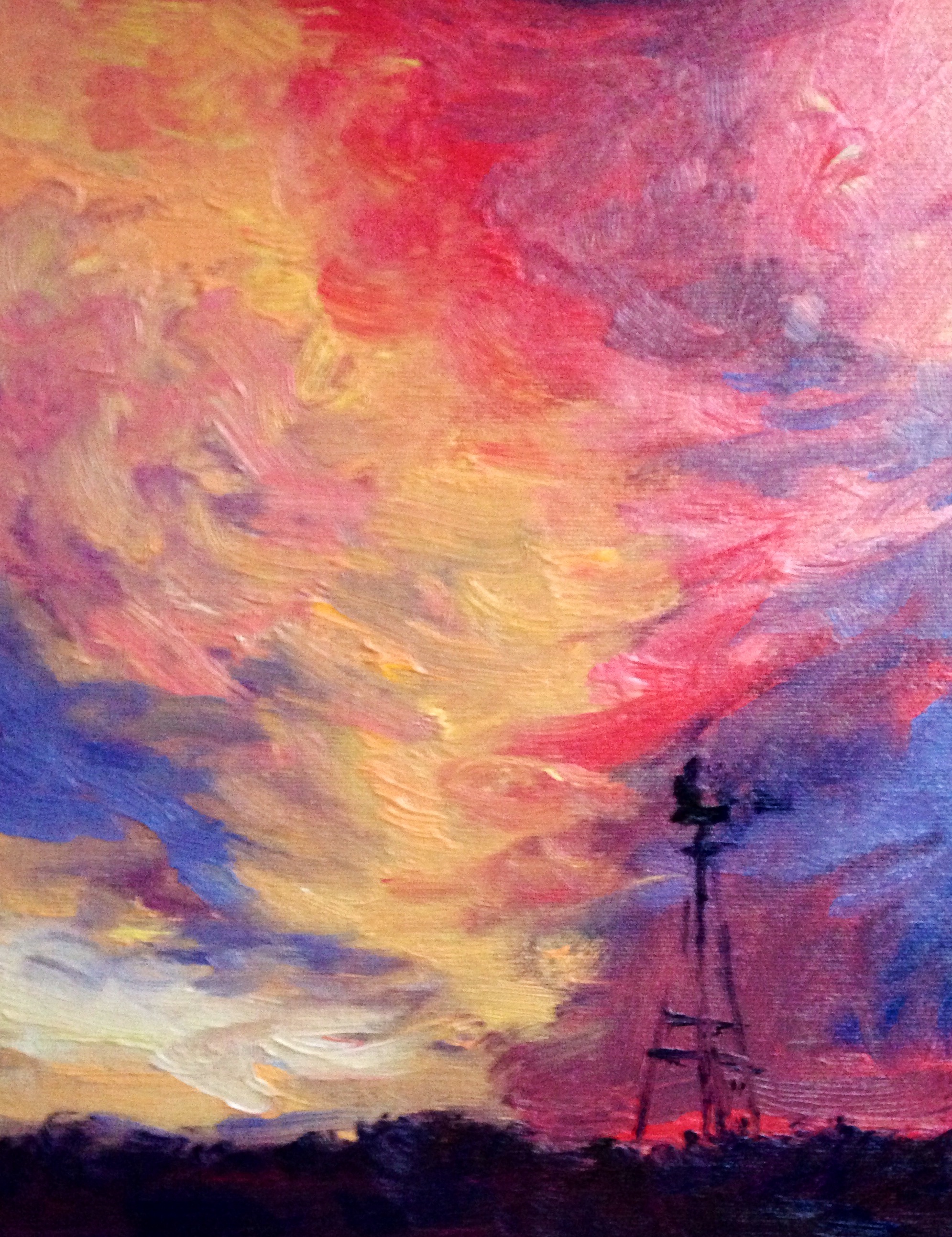 The 100K race just closed. Our last runner came in just after midnight, so we were all warm and snug this morning. I painted the sunrise from memories of what I have seen in Bandera, and what I imagined could have been. The temperature was between 29 and 32 all day and night. It rained on and off. Trail running is the only place in my life where people voluntarily push themselves to the limit, and then willing accept help from strangers when they are vulnerable. It is crazy and beautiful all mixed together. So we are headed home with a car of wet, muddy gear and family and friends that grew closer making it so.