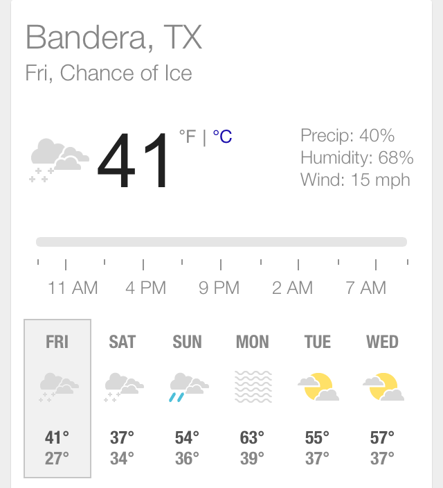 We have made an annual camping trip to Bandera, TX the second weekend in January for the last dozen years. My trail running/backpacking husband says there is no such thing as bad weather, only improper gear.