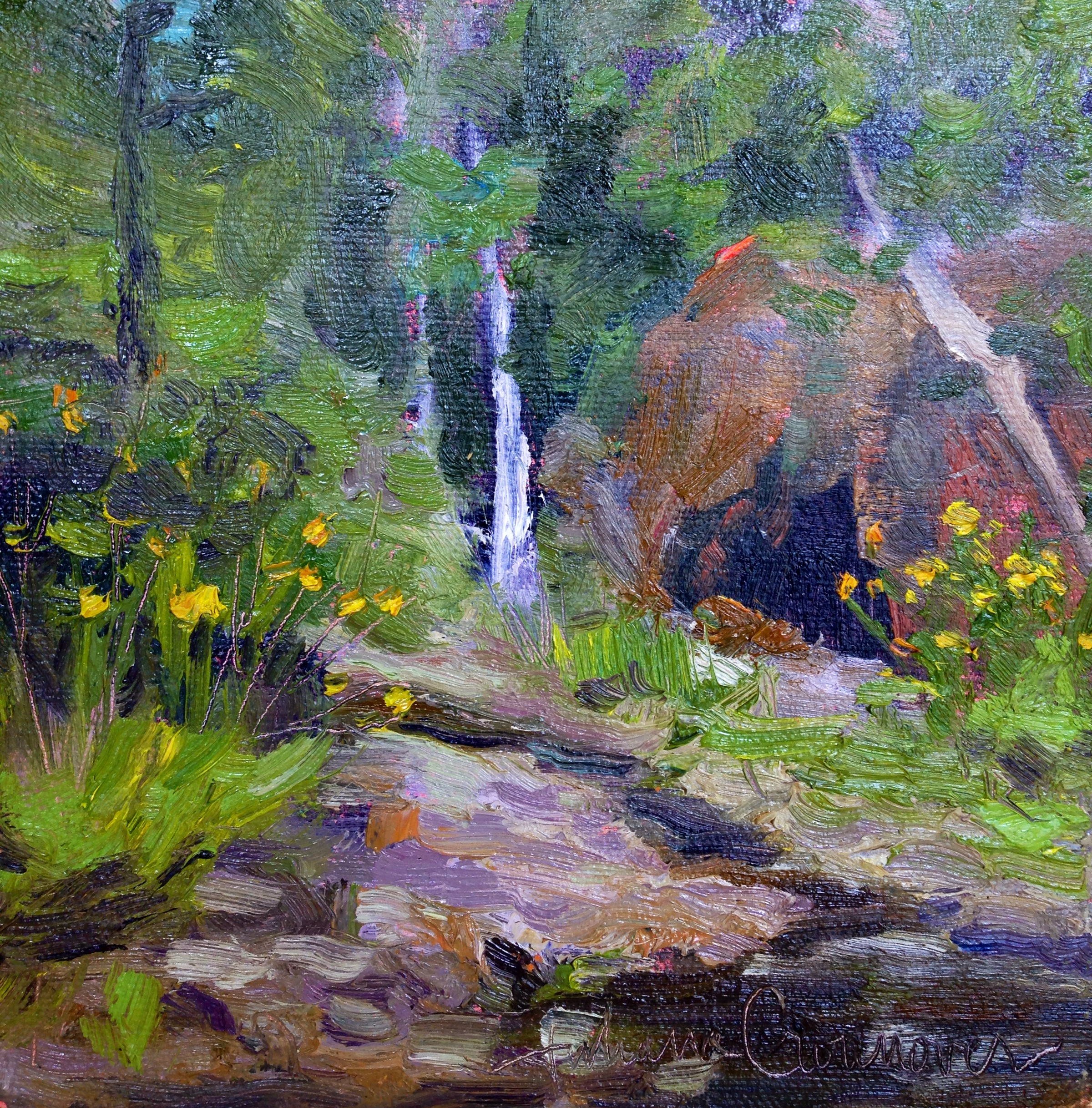 This is absolutely beautiful – with the bright flowers, and the waterfall, and the inviting mystery of the cave entrance. Made my day, thanks.