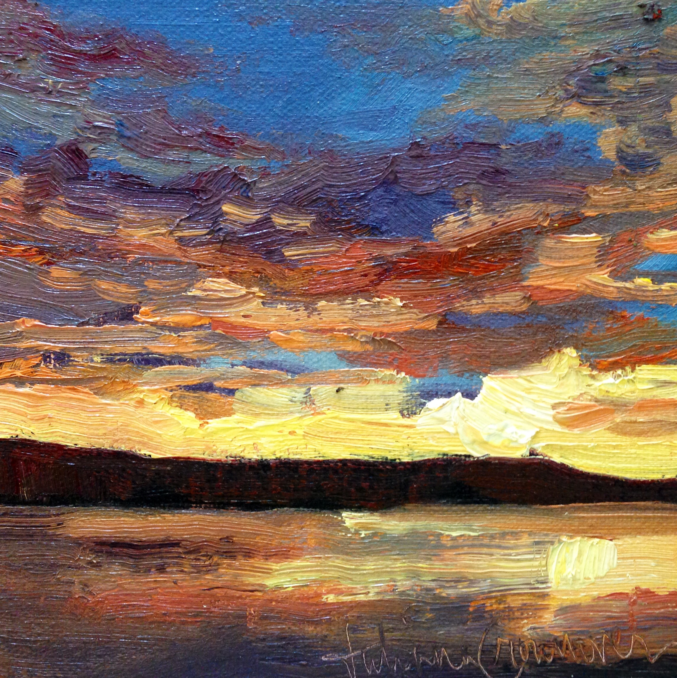 6×6 oil on panel Sunrise moon’s shell cracks – her yoke falls on the edge of the sea scrambled horizon