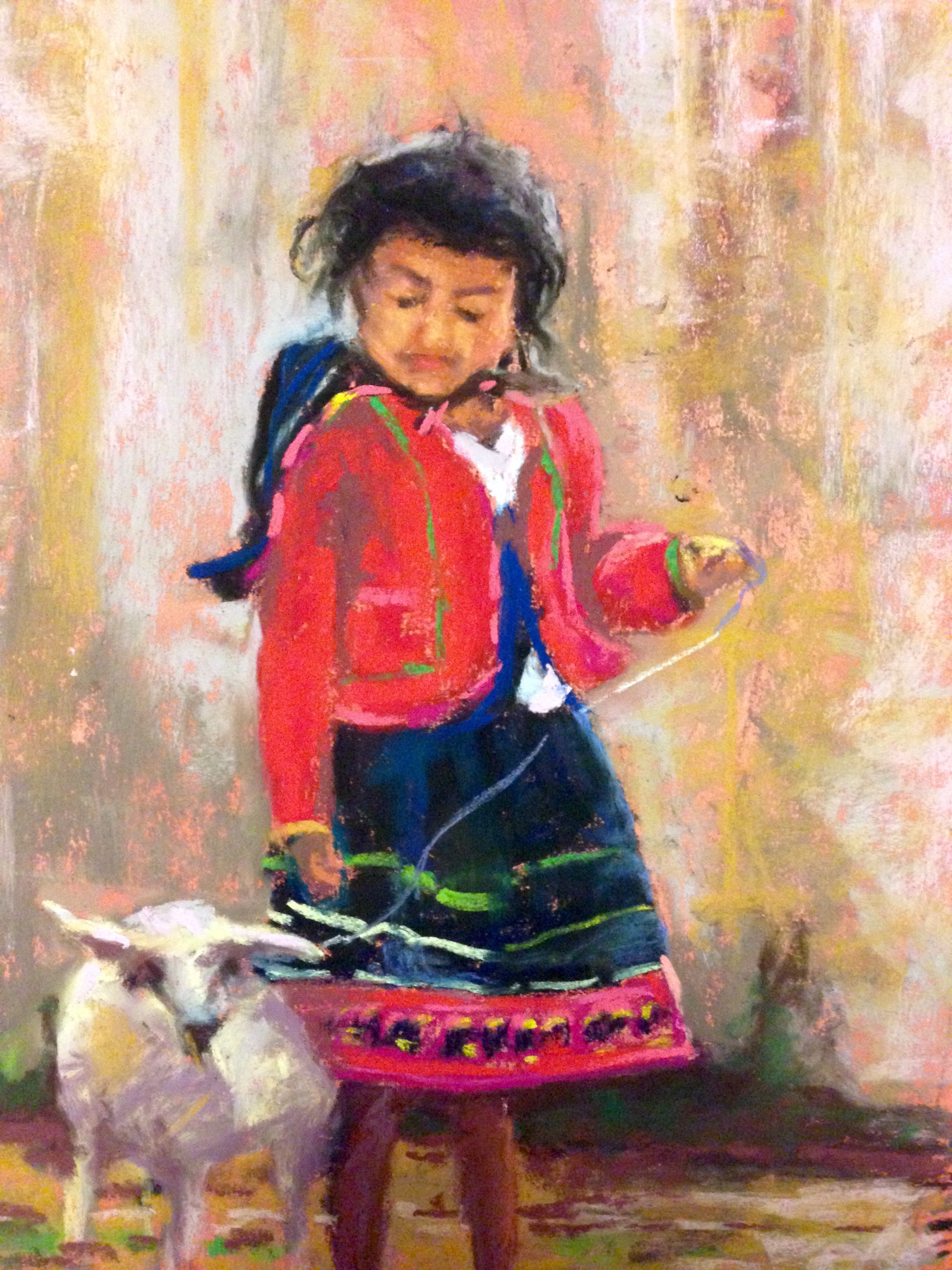 Cusco, Peru. This is the oldest continuously inhabited city on the continent. If you ever visit, you will know why people have lived here so long, it is really special. The altitude makes the light really beautiful, and we are close enough to the equator that it is pleasantly cold, but not freezing. Plein air painting is delightful!