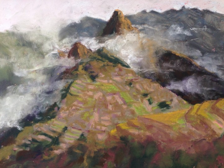 I hiked to the top of that super steep mountain, Wina Pichu. At the top I laid on my back and felt the earth, just as our guide told us to do. On the way up it poured rain, and every now and then the clouds would part in and out giving us sneak peaks of the city of Machu Pichu below. This morning I rested, and painted what I remember in hopes of capturing some of what I experienced.