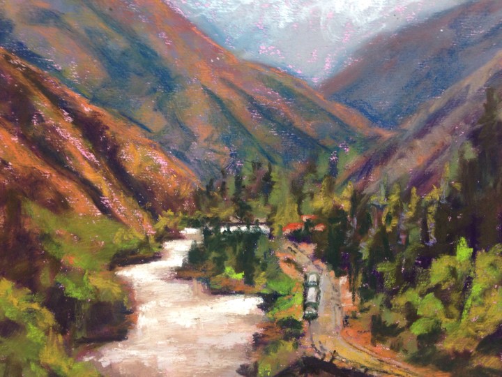 I just finished the Inka trek to Machu Pichu. It took four days of hiking, with thousands of feet of elevation change. We experienced breathtaking views, hot sun, pouring rain, wind, freezing clouds, archeological sites, and amazing floura and fauna. Words and pictures can’t quite sum up the experience. This painting is my first attempt at hinting at Inca ruins. I wanted the effect of dabbing people into a beach, a few strokes without every complicated detail.