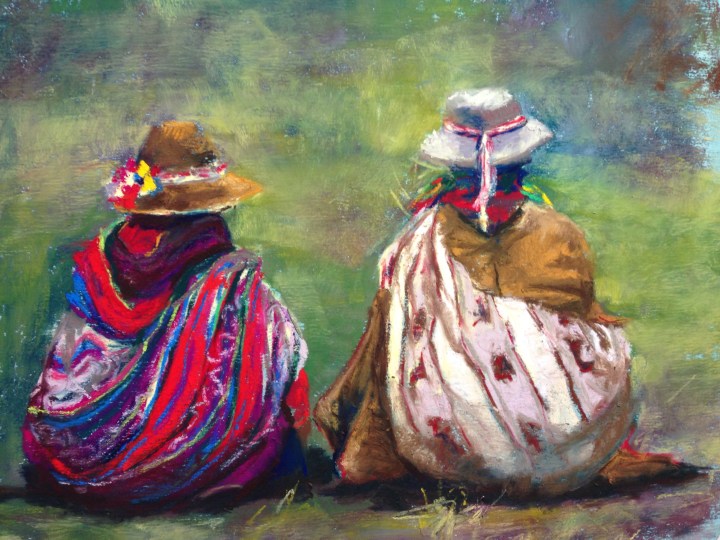 Like the women of Peru, I carried my babies and toddlers on my back. I shared this joy with my, now, closest friends. The women sitting in this painting don’t have babies on their backs, but like many Peruvian women, continue to carry heavy loads on their backs long after their babies are off on their own.
