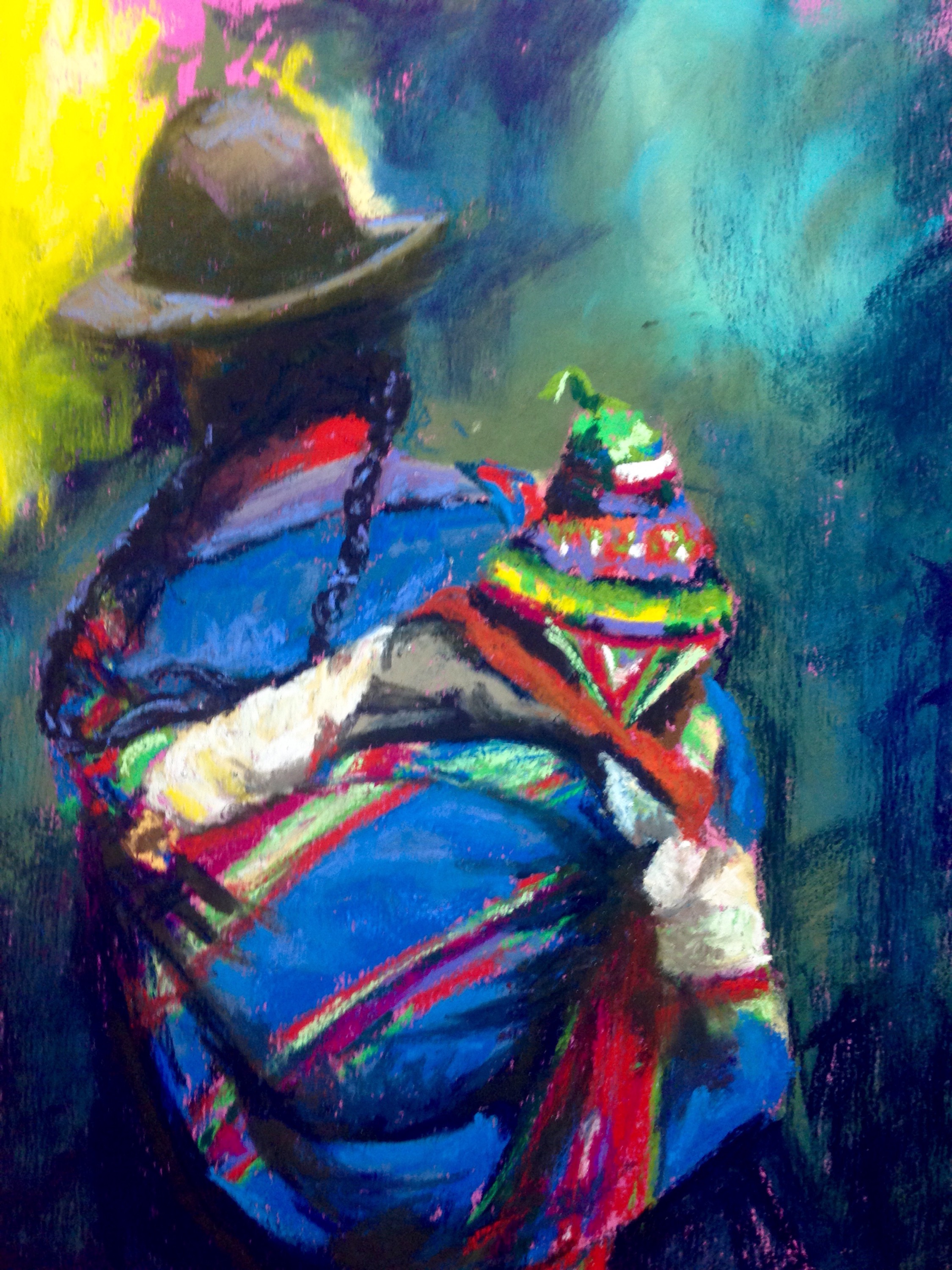 Like the women of Peru, I carried my babies and toddlers on my back. I shared this joy with my, now, closest friends. The women sitting in this painting don’t have babies on their backs, but like many Peruvian women, continue to carry heavy loads on their backs long after their babies are off on their own.