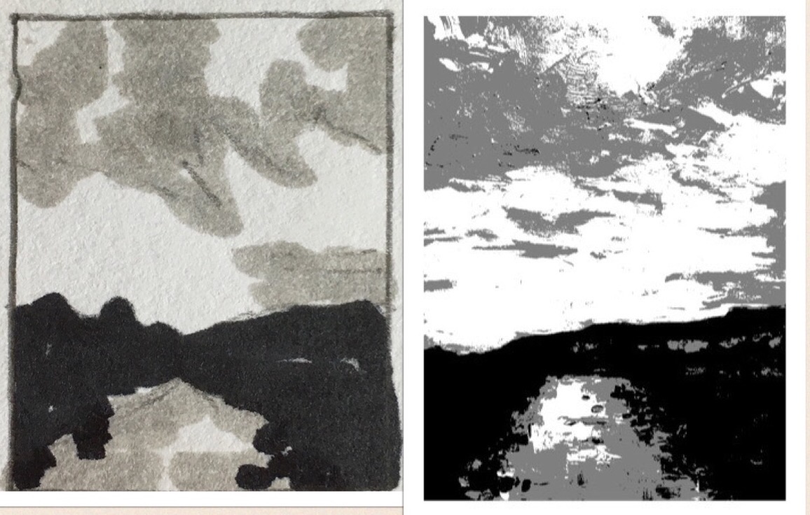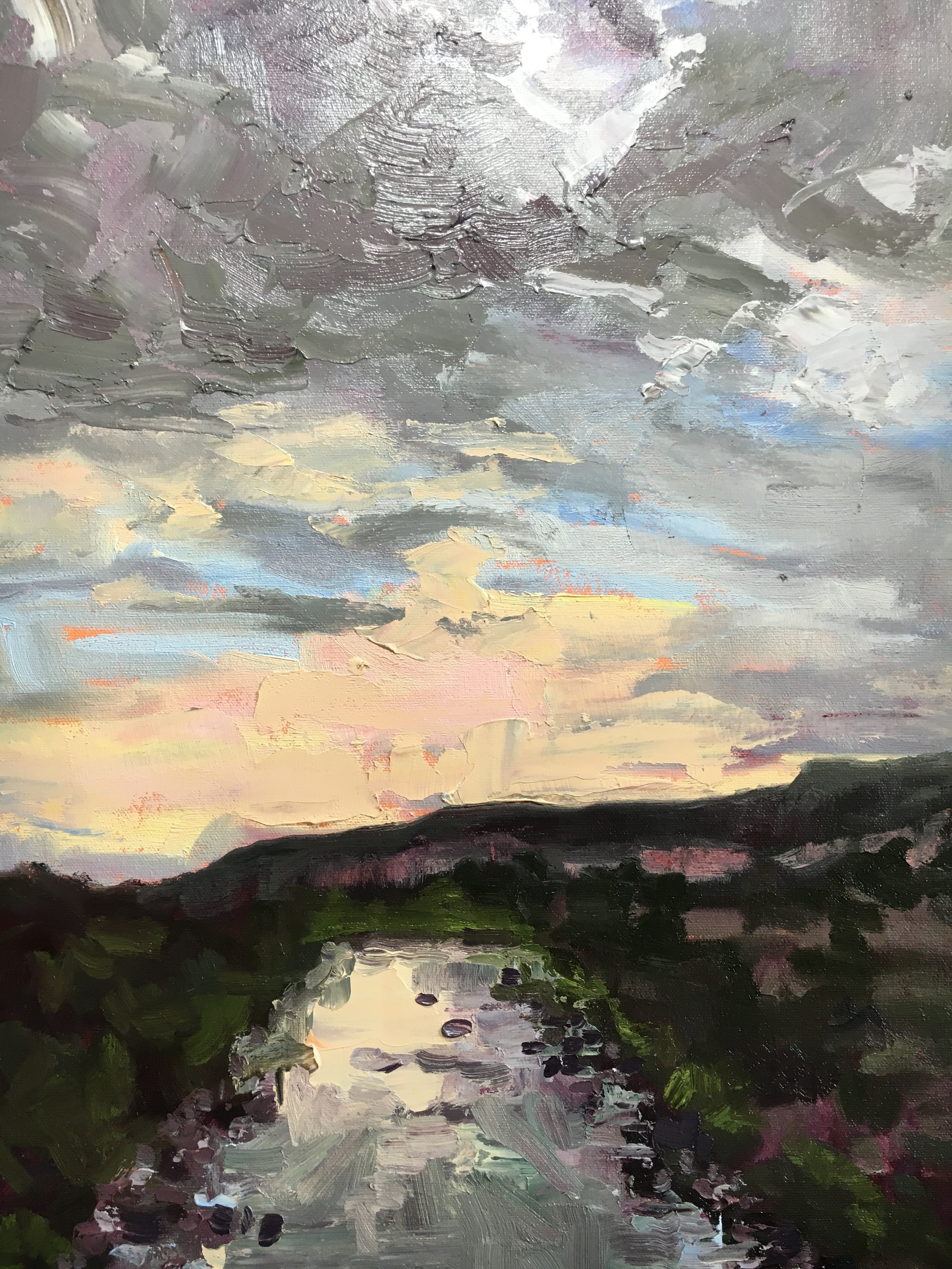 I painted my piece alla prima, stood back and tried to problem solve.  First question “did I stick to my values?”  With a quick glance at the value thumbnail and the finished painting, the answer is “NO”