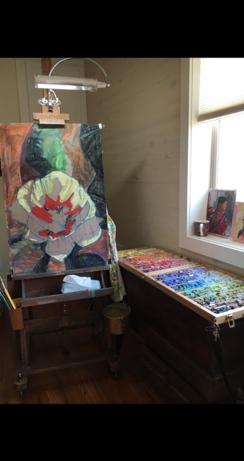 The most recent is in the lower right hand corner. It is special because I painted it 10 times bigger than I normally work! Here is a work in progress picture on my easel (look to the right to see my coffee cup to get an idea of scale)