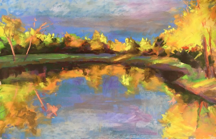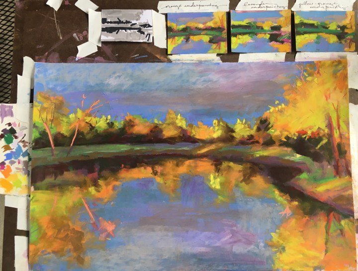 This painting captures beautiful morning light on my pond. Below are my studies. I tried toning the paper with 3 different colors and doing small studies to see which color I preferred. I went with the lavender, which was I interesting because I would have guessed the orange or yellow orange would have been my preference.