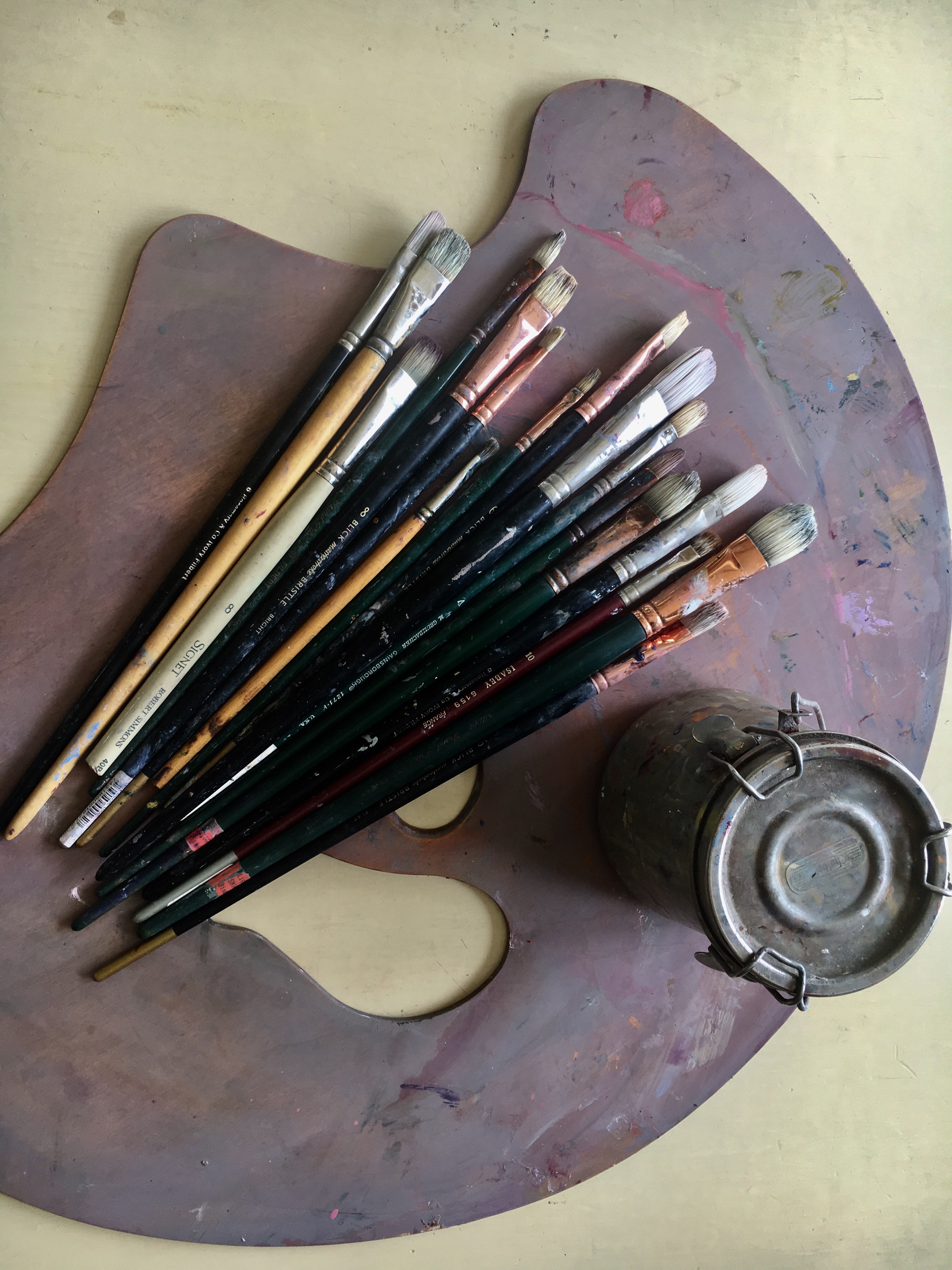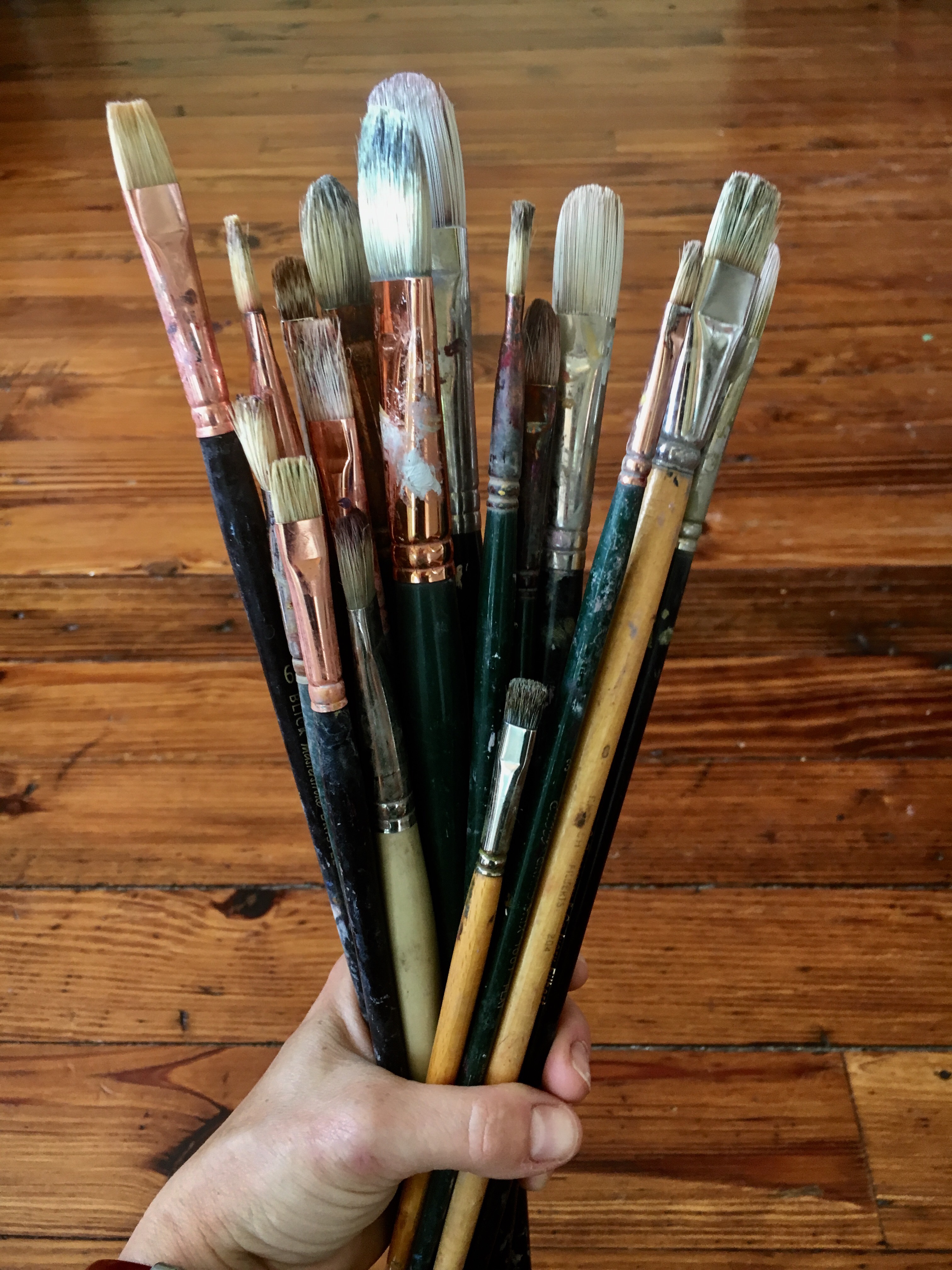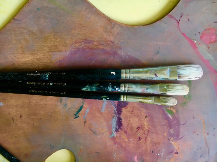 I take excellent Care of my brushes, and they last for a really long time. Above are the brushes that have been my go to brushes for the last year. I recently started a painting and noticed that the brush was shot, the bristles had lost their ability to hold an edge, and they were droopy. I reached for a second brush, which was also shot. So I looked through all the brushes that had been in circulation. Three were in almost perfect shape despite constant use. They were rosemary and co. Ivory filberts. Synthetics! I was ordering some portrait brushes about 4 years ago from Rosemary and Co, and the person on the phone asked if I had tried the Ivorys. I told them I didn’t usually like synthetics, but would give them a try, I ordered only 3. Initially they were fine, no better or worse than a bristle. However they have held up MUCH better than the natural bristle brushes.