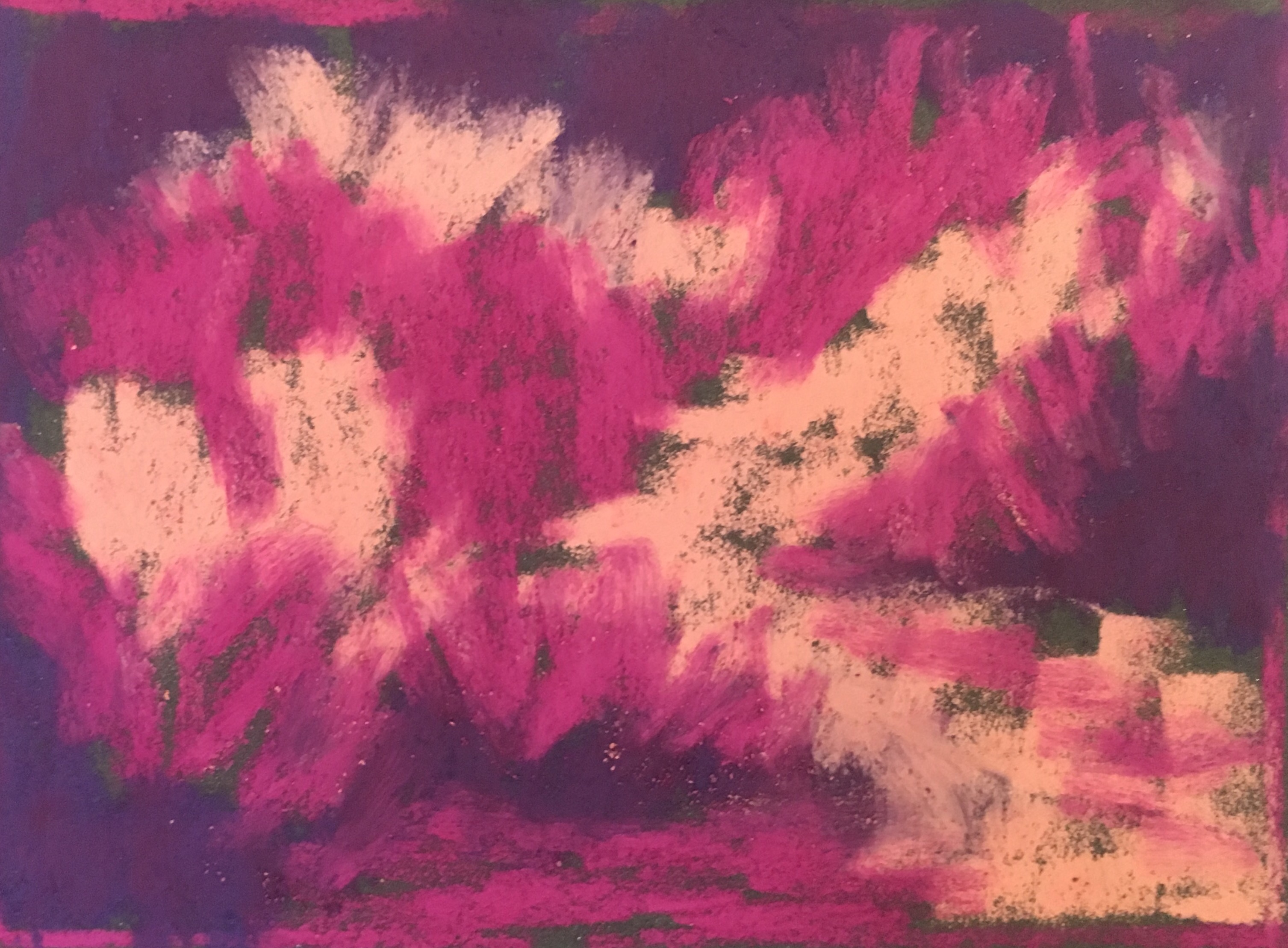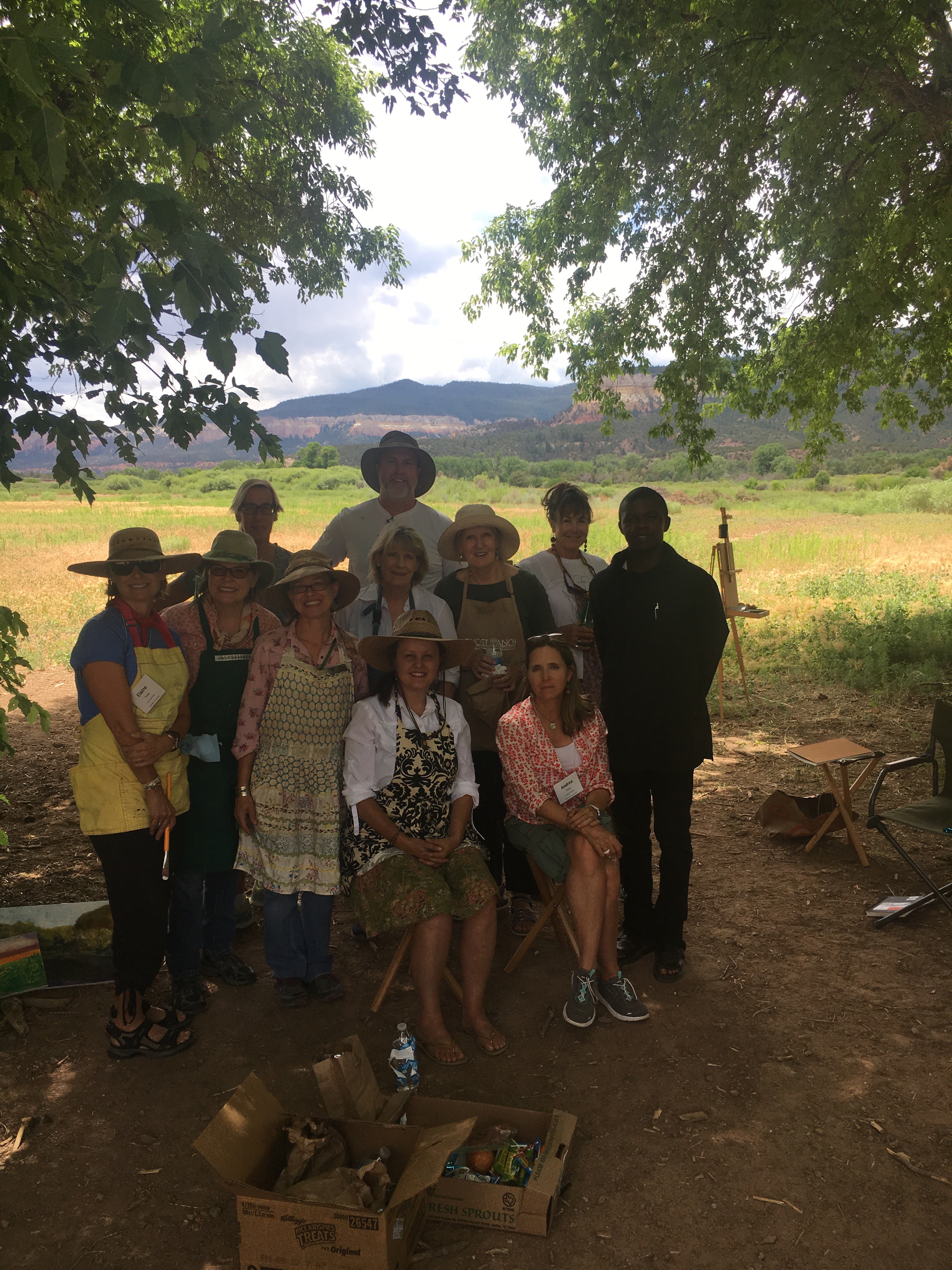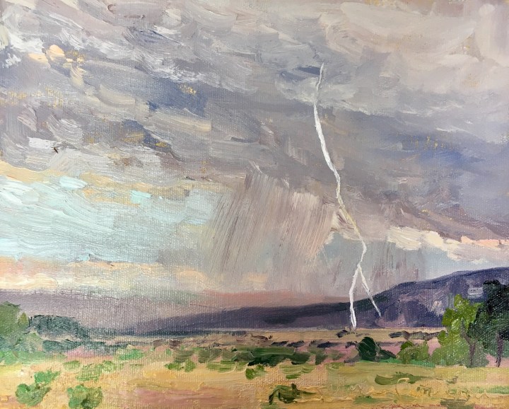 I have an artist friend named Ginny who lives in Denver/ Taos. On lucky years our paths cross at Ghost Ranch and we have a chance to paint together. We had a beautiful evening to paint, in addition to a fantastic lightning storm, there was an even more lively ultimate frisbee match on the lawn in front of us. In chairs scattered around were readers reading, old friends reconnecting, and spectators enjoying the show. If the colors seem muted, it was dusk, and…I was contented.