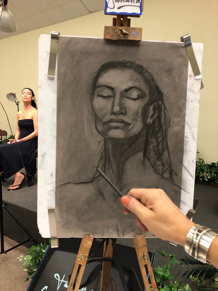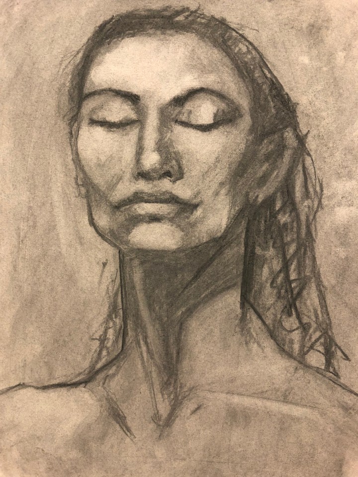 Drawing from life. I started with a gesture, and then found smaller shapes, then shadow shapes…and along cane a face from all those shapes!