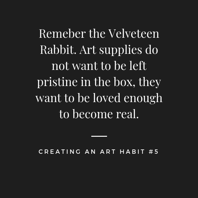 I personify my art supplies. I imagine they talk to each other the ways the toys in the cabinet did in “The Velveteen Rabbit.” The brand new ones are snobs acting fancy, but the much loved art supplies know that they really aren’t worth much as art supplies, their true value lies in the potential art they may become.