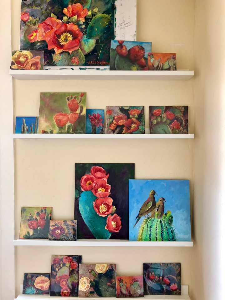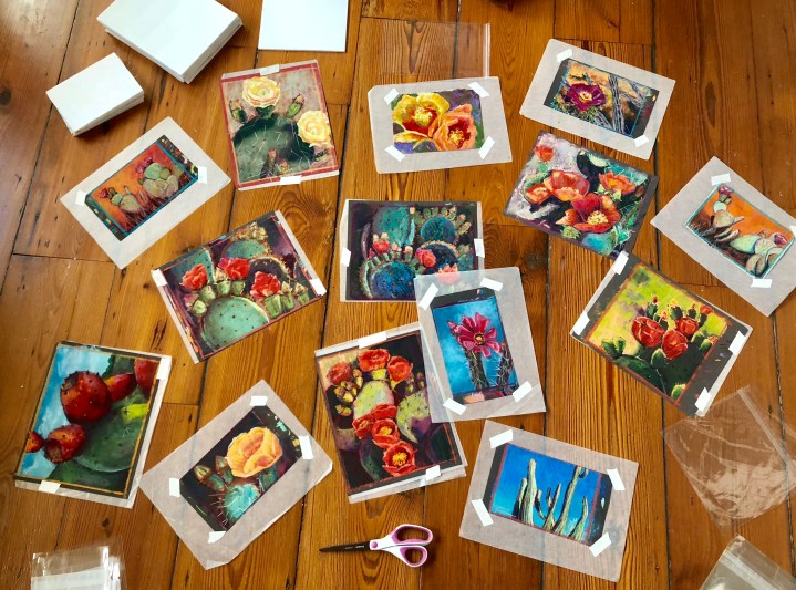 Today I packaged up some original cactus pastels. I love to make and sell original art, and I have found a practical cost effective way to do so. I slide pastels into a clear plastic sleeve that matches the size of the original art, and then slide a piece of foam core behind the artwork. This allows me a smudge free way to handle finished pastels and they are much easier to store and ship than frames.