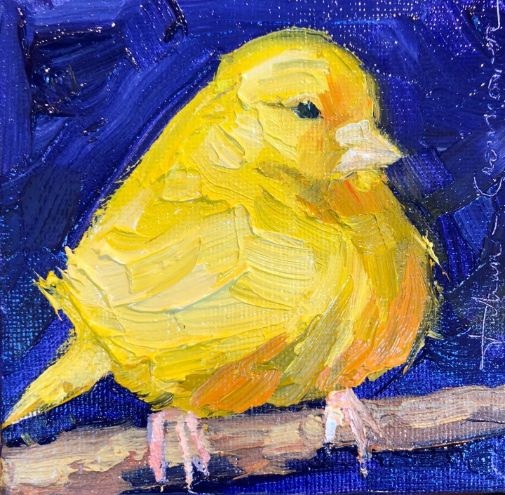 This little guy makes me smile. What a little, round, ball of sunshine for a cold day! He puffed up to make himself warmer, and the effect brings joy to all who pass him.