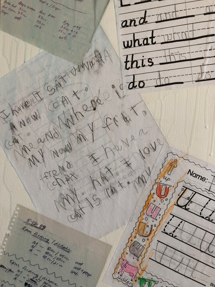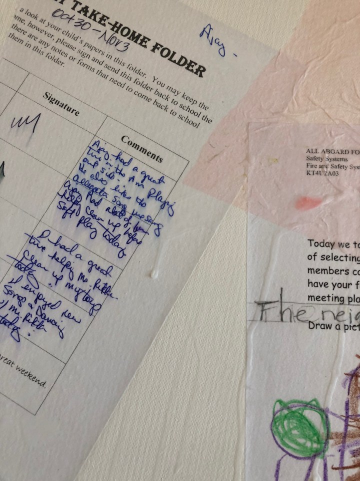 I started this commission that I am super excited about. I made a time lapse video, which makes this slow progress kind of fun to watch. Under everything is a layer of collage from the family: their wedding vows, feeding and diaper notes from when their triplets came home, and preschool papers. It is so special and sweet when those papers hide and seek through a finished painting.