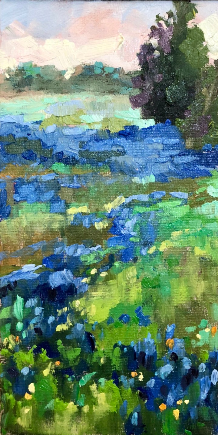 4″x8″ oil on panel Lady Bird Johnson:” Where flowers bloom so does hope.” At the end of my street is a small park, with amazing bluebonnets. I should dedicate a workshop ton painting these beauties.