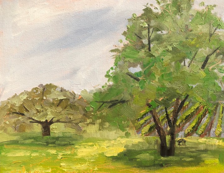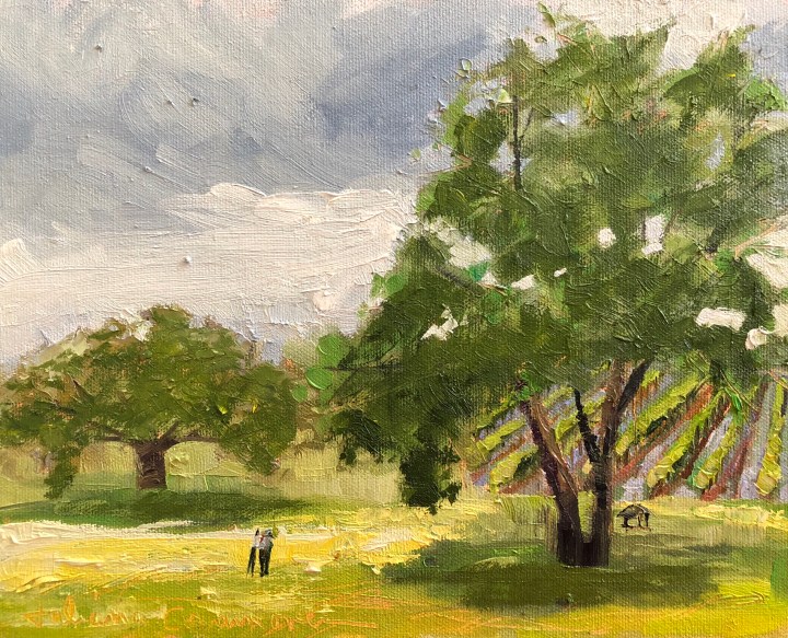 I finished this plein air study (see below) and it was a fail. It was a beautiful day at a vineyard, but the painting didn’t turn out. Why? I botched the values. So today I added some darks into the trees, and a few strokes that represent a plein air painter.