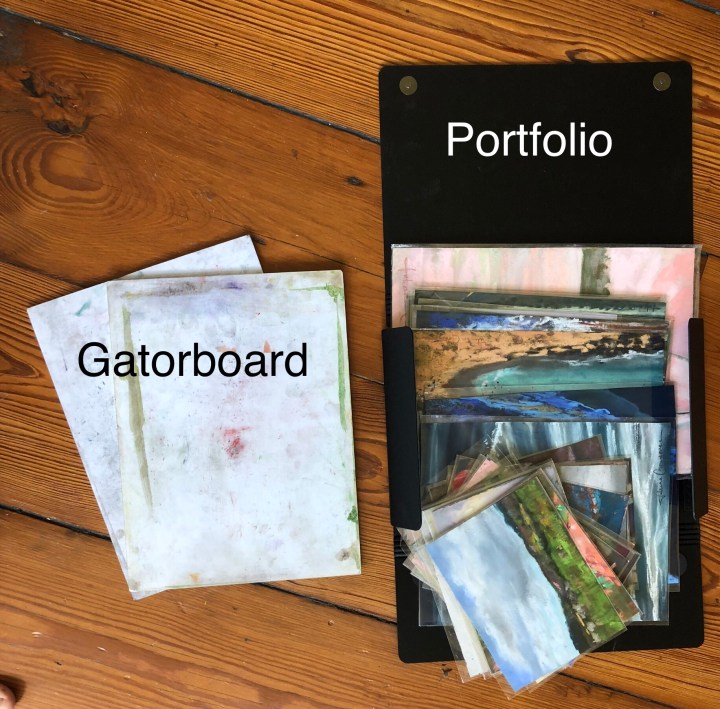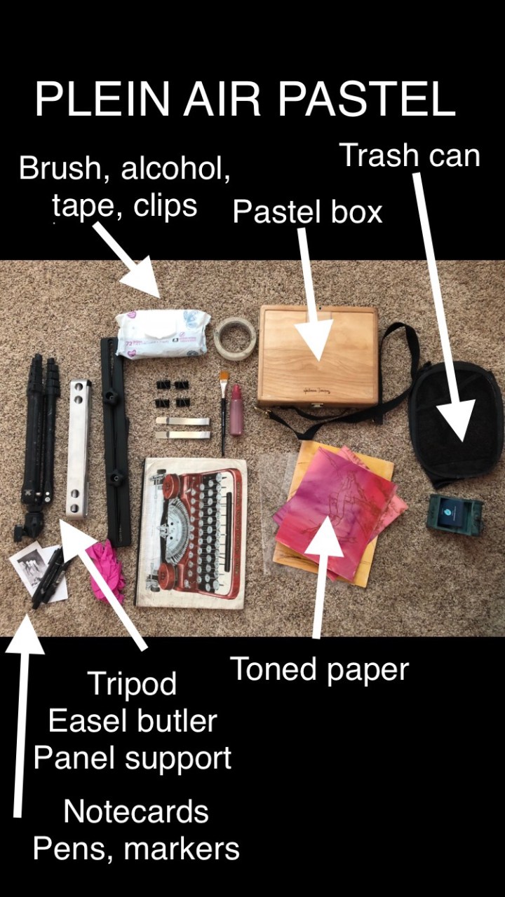 Notecards, grey markers, and a pen for making notes, labeling paintings, and doing value studies. Gloves, baby wipes, and a small pop up trash can. Clear envelopes to put finished artwork in, this allows me a practical way to show people unfinished paintings without them smearing. A portfolio to store finished work in. Clips and tape to hold paper to the support panel, I love bankers clips because they easily slide, so I can paint an entire painting edge to edge. Apron, Sunhat, insect repellent, sunscreen, snack, and water. I use a sturdy school sized backpack to hold all these items.