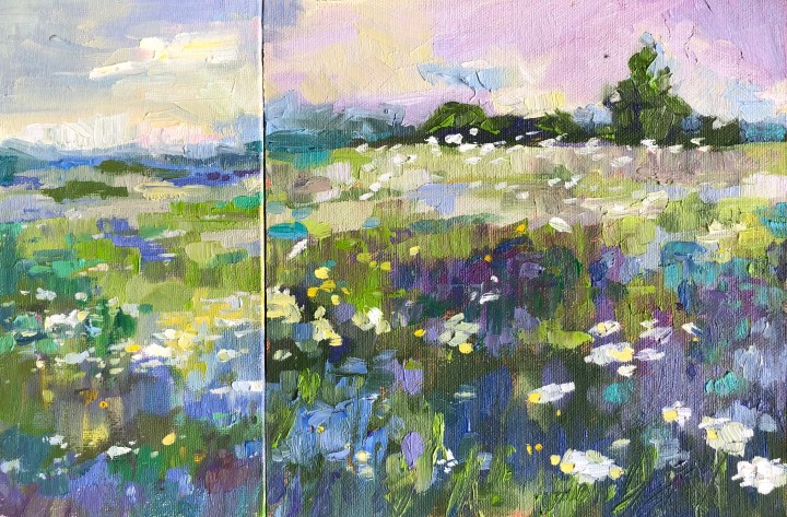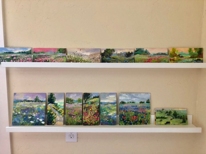 I have a set of shallow shelves by my easel where I put recent works to dry and look at. I put up the 8″square I painted yesterday, and chuckled at the fact that I put the horizon line on almost the exact same spot on all the 8″ tall paintings. And I wondered…could any of them work together? SCORE! I found an 8″x4″ that looked great with the square. I made a couple of color adjustments across the seam, but mostly I let the differences stand. I love them together!