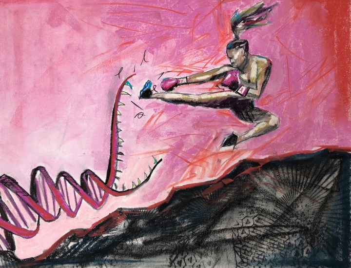 Breast cancer cells look a bit like a blob, if I were creative, the boogie man. That didn’t work for me. What about genes, could I play with that? Cancer seems evil, what about the dragon being an archetypal symbol for evil?
