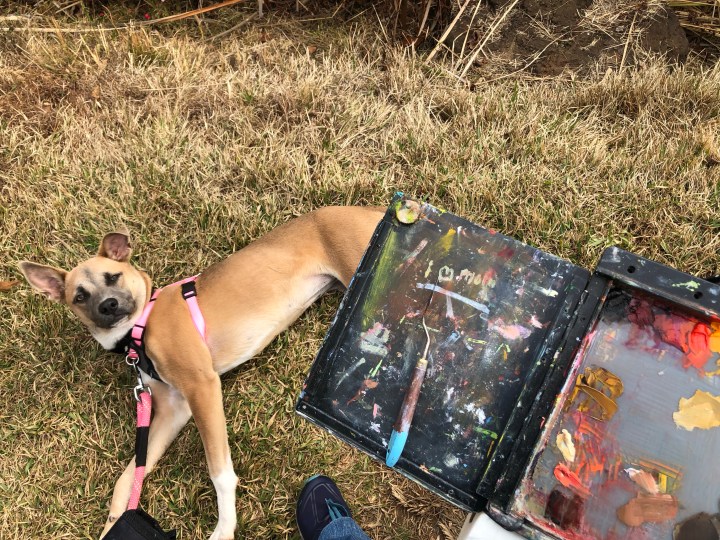 Meet Daisy. She is happy to hang with me while I paint, until we go on a hike together. As you see here, she is very relaxed, as she wedged herself between my legs and delightedly rolled on her back. Do not be fooled, she is not checked out. If you were to, walk up behind me onto this little peninsula, she would protect me with her life. She demonstrated this to a fisherman and a very friendly dog who weighed several times as much as her.