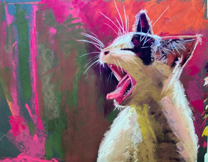 I painted this guy in the Sammons Cancer center. I set up my easel and painted. Patients, caregivers, and staff watched the cat come to life as they passed through the busy atrium.