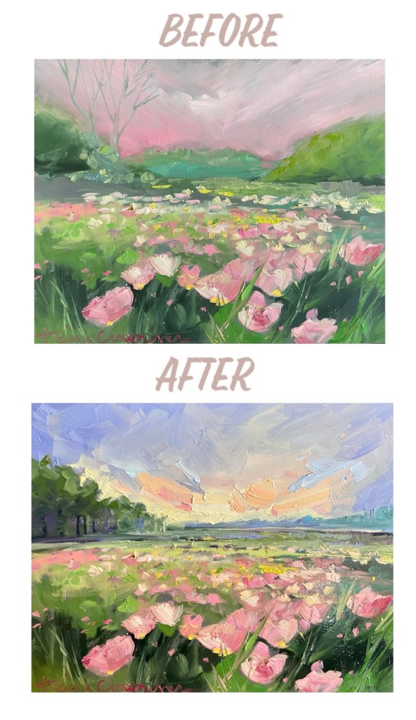 I LOVE before and after photos. Pretty much across the board: haircuts, house remodels, people after they have lost weight – all of it. Taking something good and making it better has great appeal to me. Like many artists, I have a stack of paintings that don’t delight me. Picking them up to work through them again is a fun process. I ask myself “what can I do to improve this?” That part is like solving a puzzle. My answers often include: more paint, more values, better composition, and/or adding a focal point.