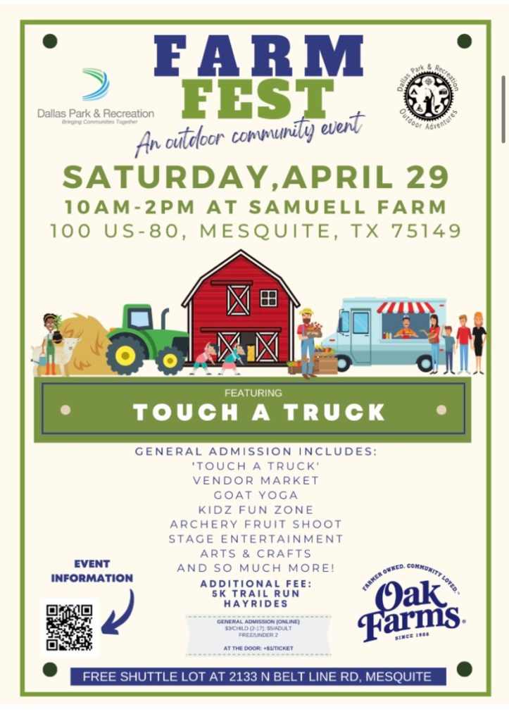The Dallas Park and Recreation Department Outdoor Adventures program is excited to present our 2nd Annual Farm Fest, a fun, family-friendly event at Samuell Farm. This event features a kids fun zone, hayrides, artisan market, food trucks, goat yoga, 5K trail run, farming and gardening demonstrations, and more!