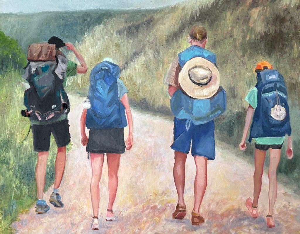 These are my kids: #3, #2, #1, and #4. I threw this painting together in a day. I painted the poppies the way I remember them, a blanket of red! I finished this painting and hung it up. I didn’t love it. I love my kids, I love the Camino, I love poppies, but I don’t love it all together. I finally put it back on the easel and asked myself the hard question, why didn’t I like it? I decided the poppies were a problem, there is just too much going on in this painting. Getting rid of all those beautiful flowers felt like cleaning out a too full closet and having to part with GOOD stuff. It was a little sad, but I painted over them anyway. I redrew the hill behind the kids I greyed the entire background down. The painting already feels better to me. Now what??? When I am focused on getting a drawing right, I often forget to be painterly, so the figures look cut out and collaged in. I’ll see if my next painting session can fix that:)