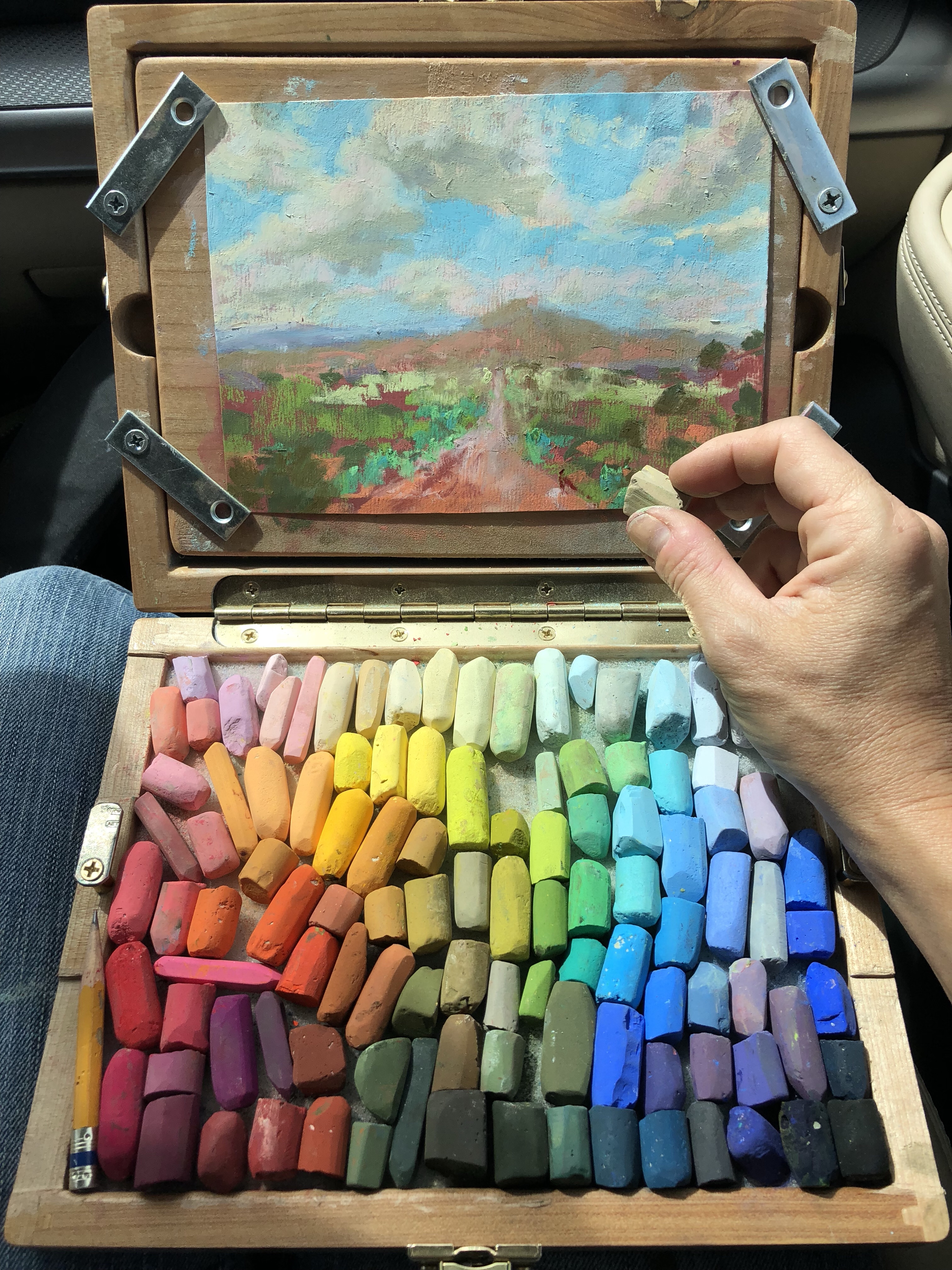 After lugging many pounds of heavy painting equipment around all summer, I came home and lightened my load! Check out my new travel set up. It is the smallest Heilman pastel box, which I carefully adapted with the help of my, clever and handy, Spanish exchange student. The box is made to securely hold pastels on one side, and carry paper on the other. As designed, there was no way to hold the support in the top half of the box so it kept sliding down. Second, the paper holder it came with didn’t work very well. After some brainstorming, we removed the stock paper holder and then added the 4 pieces of silver hardware you can see in the top of the photo. We made them adjustable, so they can hold the lid, and paper of varying sizes, in place. The trickiest part was carving out part of the box to allow room for the hardware so that the box will still close.