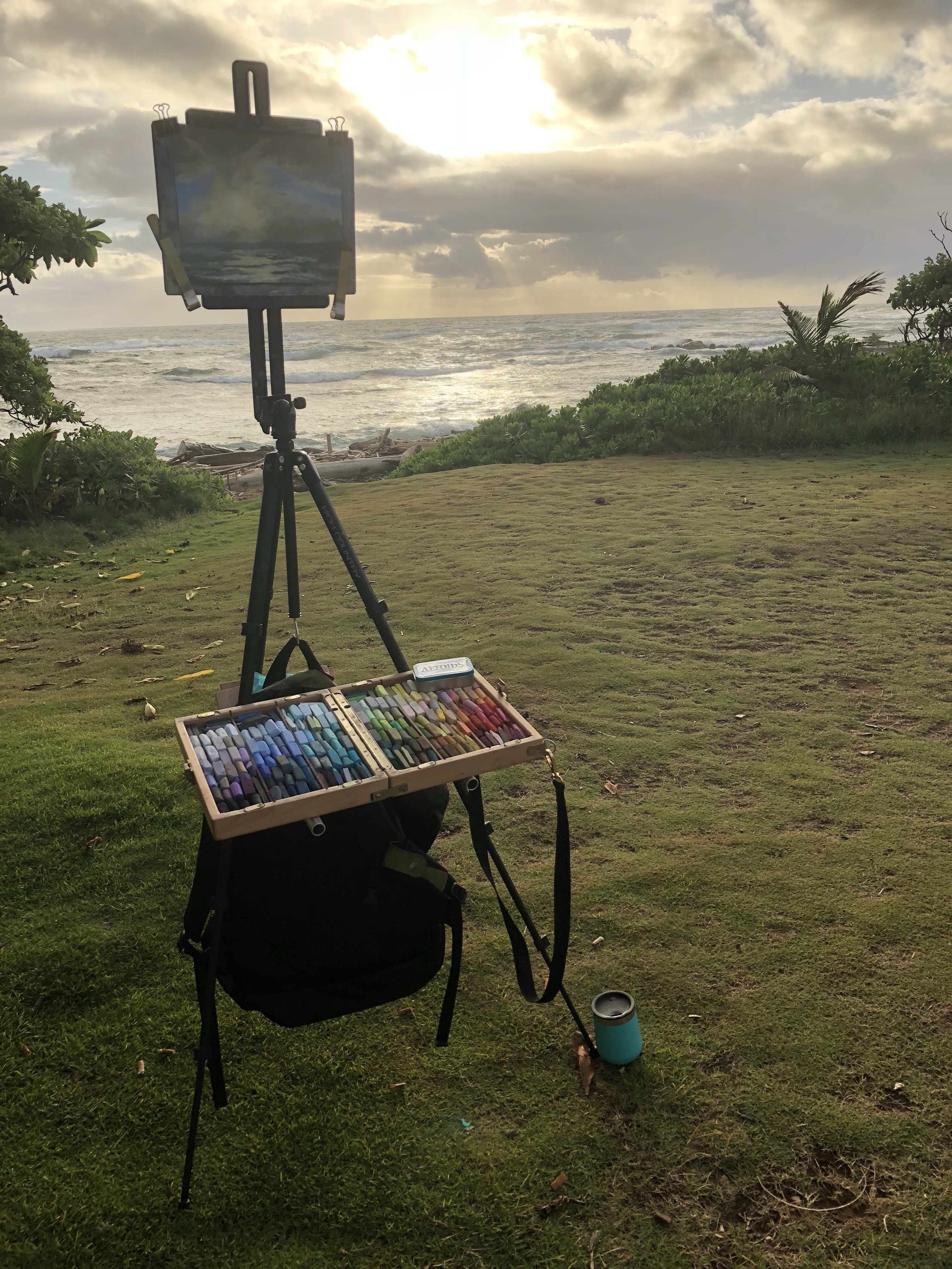My sweet husband is a runner, and he spends his runs scouting out fantastic painting spots for me. Today he made coffee in the dark, brought me to a spectacular beach, and even set up my easel.