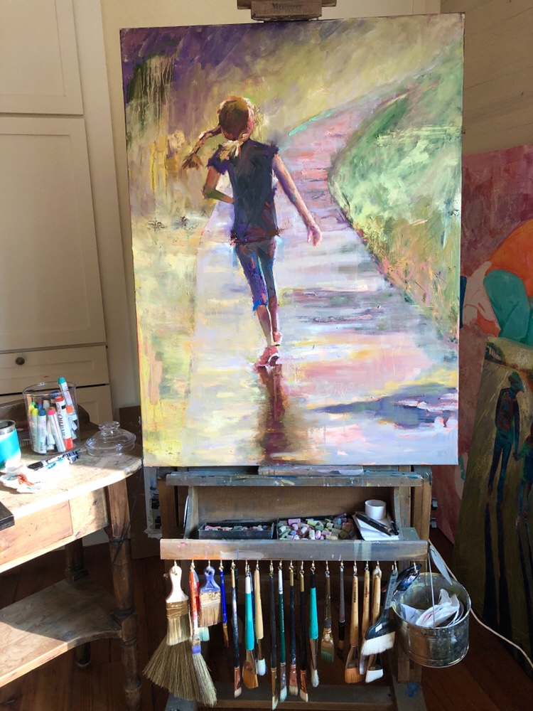I use my art as a way to notice something beautiful everyday. “Walking to School” has been a whimsical fun series chronicaling my second grade daughter’s daily walks to school. My 3 older children all start school an hour before my youngest. We like to eat breakfast as a family, so that leaves Lydia and I an extra hour every morning. What I am trying to do is not waste our gift of time, the phrase “killing time” is a phrase that makes me so sad. Instead of “killing” that time I have painted it, and all the adventures and beauty that we found in those extra hours. This series is about half landscapes of what we have seen on our daily walks and half mixed media pieces of people walking. It includes: homework, tardy slips and bit and pieces we collected along the way. In addition to many kinds of media, I have used a bit of magical realism in these paintings. For example, in “Spokes and Shadows” the light was beautiful, the shadows were beautiful, but the backdrop was generic new suburbia. In my mind, I saw a fantastic tree lined drive, with a young girl pumping up a hill onto great things. In the painting, I created the leaves with bits of homework. As the leaves fell, I could imagine the days and years and the entirety of Lydia’s childhood landing on the drive as she confidently rode into the future.